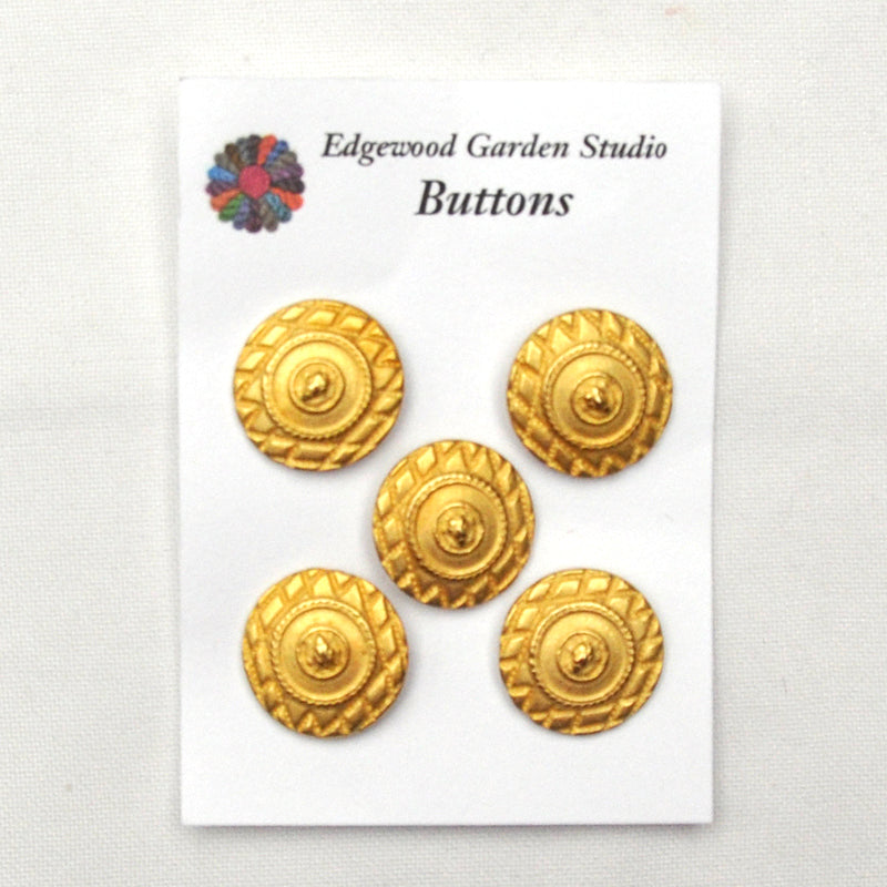 A set of five gold metal buttons with a pattern resembling a shield. Single attachment loop.