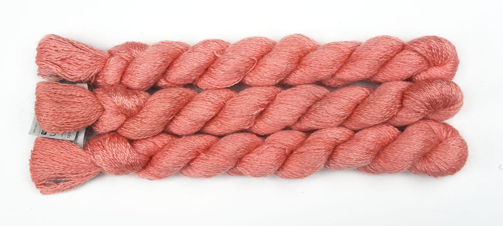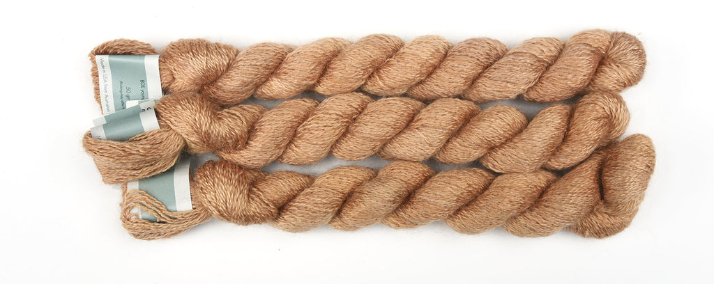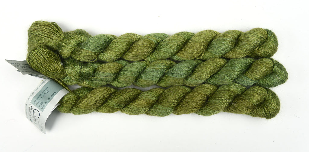 These are soft and lustrous skeins of 80% young kid mohair and 20% silk in lace weight, dyed in solid or subtly variegated colors. This unbrushed mohair has minimal halo