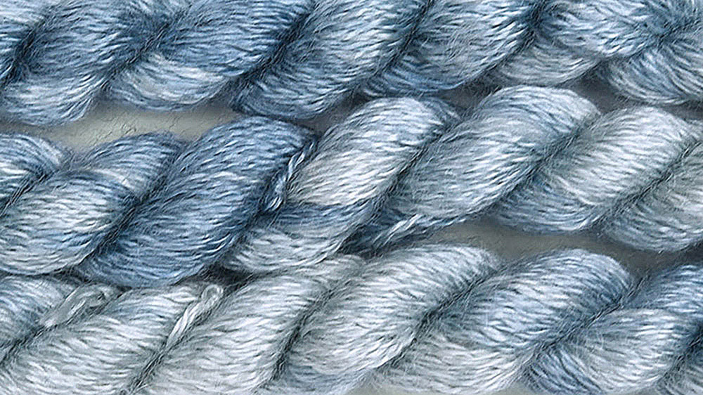 These are soft and cuddly skeins of 100% unbrushed young goat mohair in fingering weight, hand painted in variegated shades. It has a bit of a halo, but it is not scratchy.