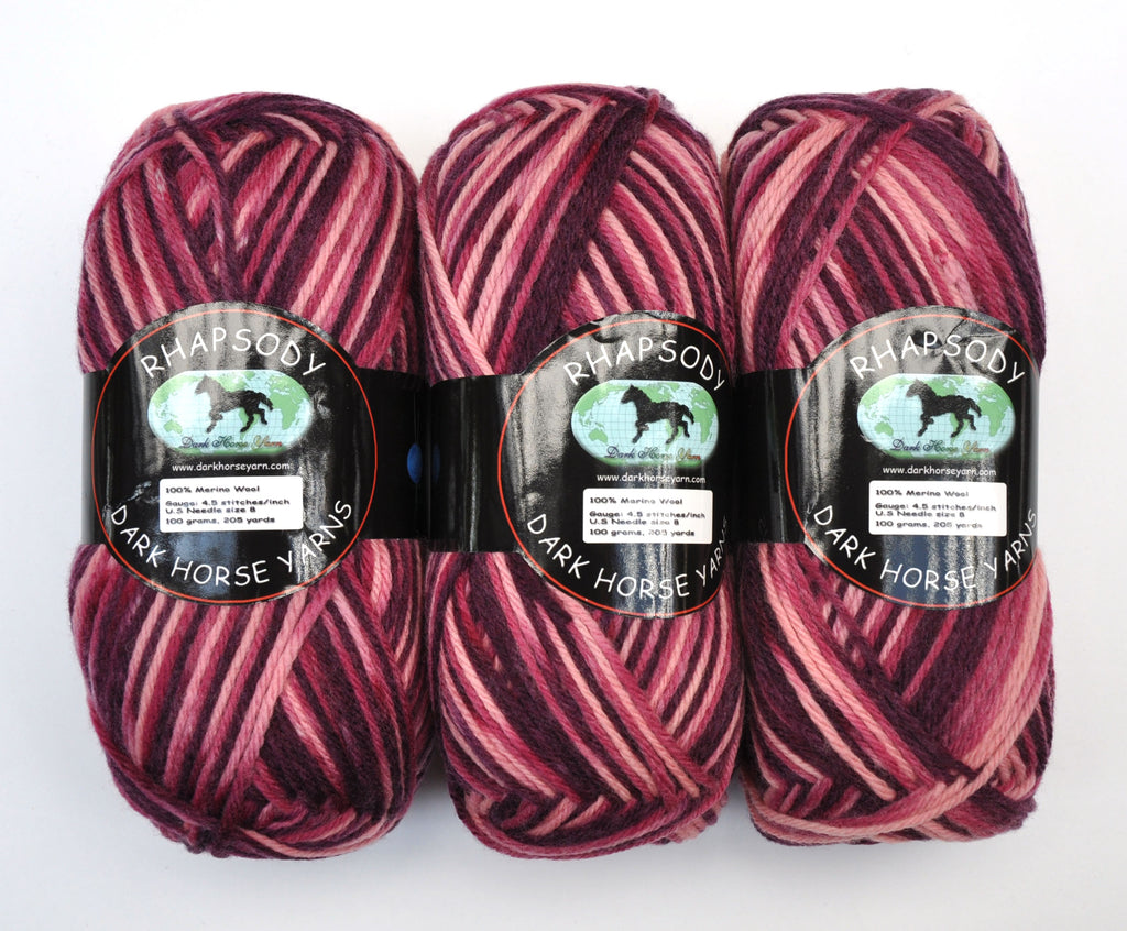 Dark Horse "Rhapsody" Yarn - Merino Wool, Worsted Weight, 205 yards - Red, Pink & Purple