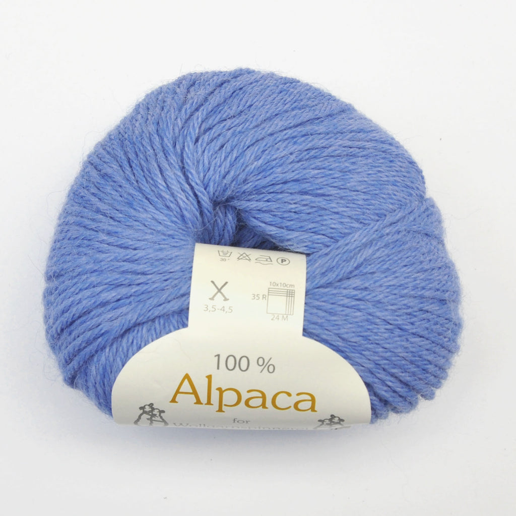 This is a soft worsted weight yarn made from 100% alpaca, in a solid shade of blue.