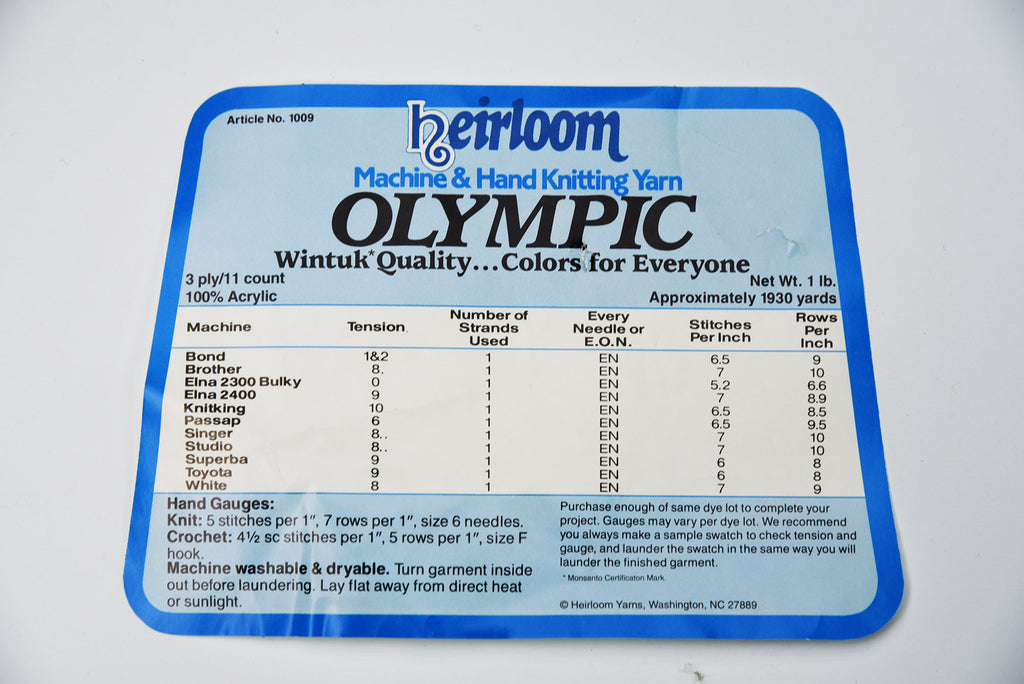 These vintage yarns cones were made by Heirloom Yarn. This is their "Olympic" line, product number 1009, which was made from wintuk, a variety of orlon acrylic fiber. It is 3/11 DK weight. Each cone weighs about 1 lb (plus the cardboard cone) and is approximately 1930 yards. This should be good for most projects, and will work well with knitting machines as well as hand knitting and weaving.