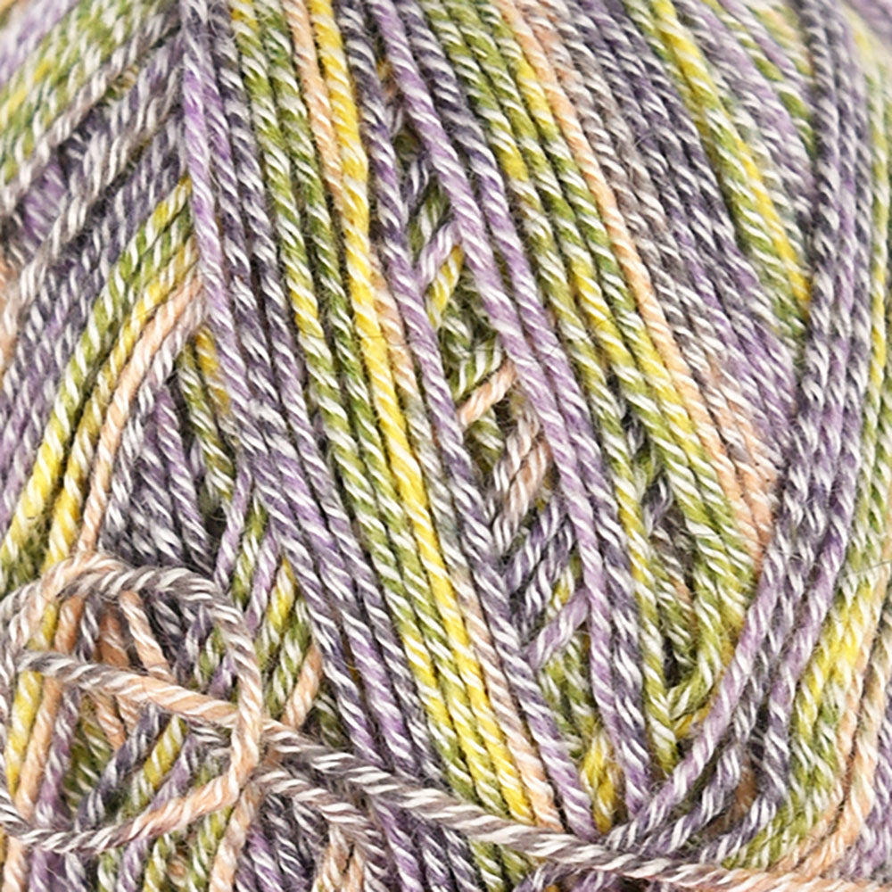 This is a machine washable fingering weight yarn made from 45% cotton, 40% superwash wool and 15% nylon. It is part of the Plymouth "Italian Collection". This line was discontinued for a while, but has been revived by Plymouth under the name Shades of Sockotta. This particular colorway, called Vineyard, was from the original series. It is purple, yellow and green.