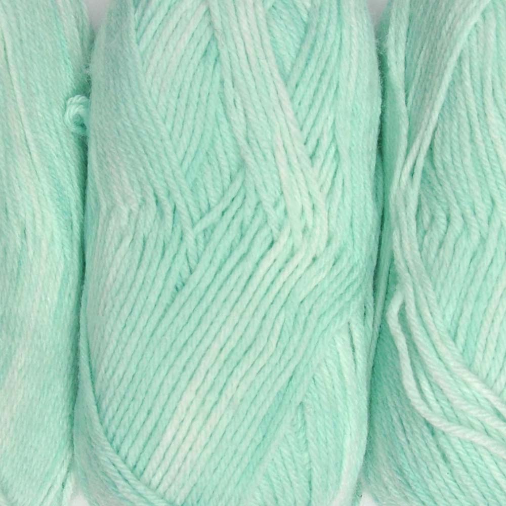 This is a soft synthetic yarn from Sirdar, particularly intended for knitting items for babies and toddlers. The dyeing has a light variegation which produces a delicate stripe effect. It is DK, and the color is shades of palegreen.