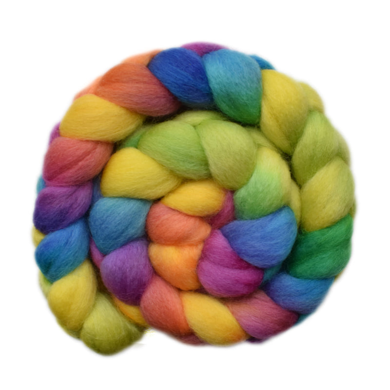 This roving is shades of green, yellow, blue, orange and purple.
