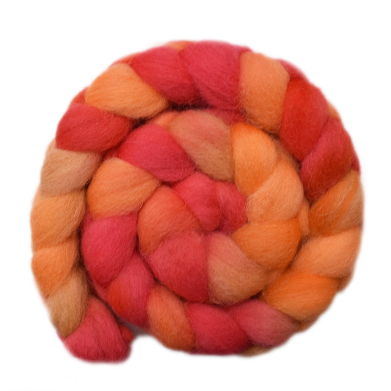 This roving, or more properly combed top, is shades of red, orange, pink and yellow.