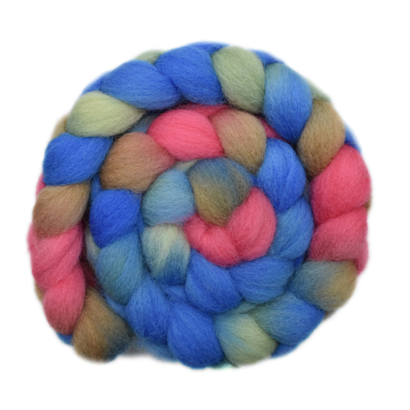 This roving is in shades of blue, salmon, green and tan.