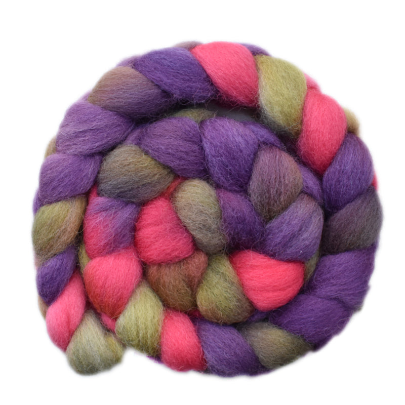 This roving is in shades of purple, salmon, green and gray.