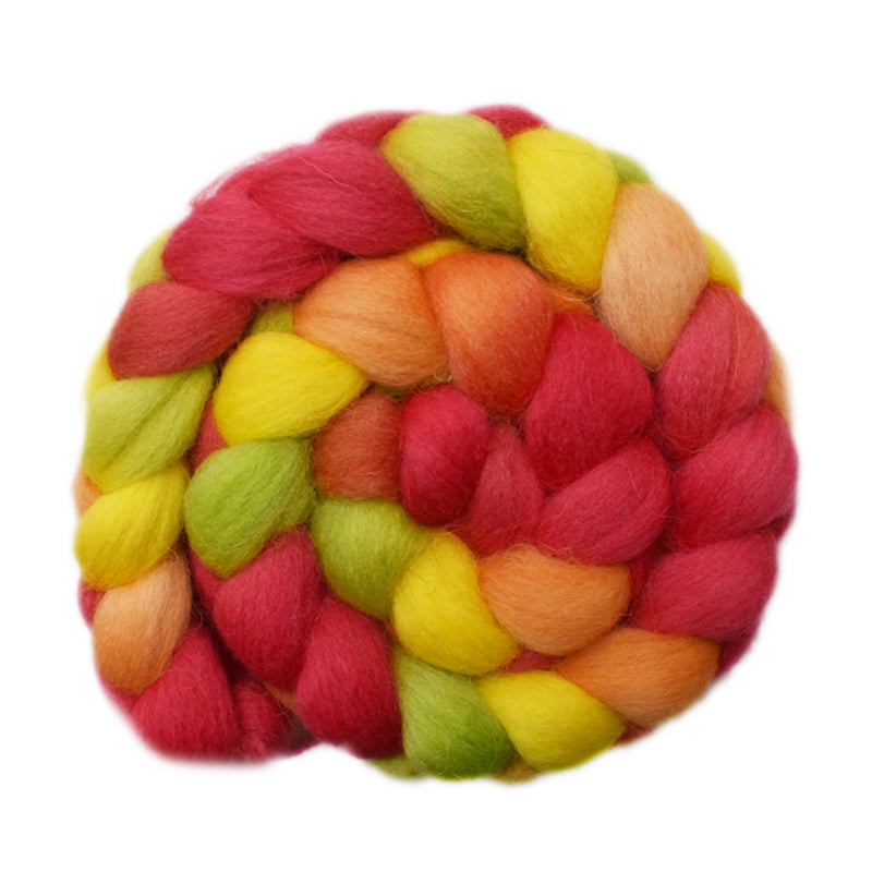 This roving is shades of red, yellow, orange and green.