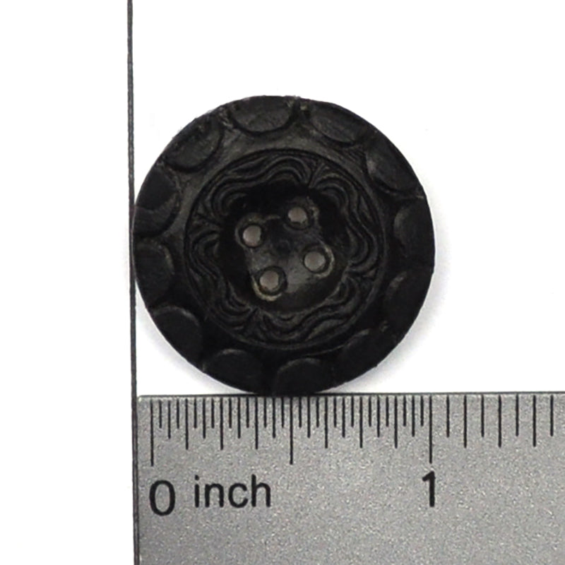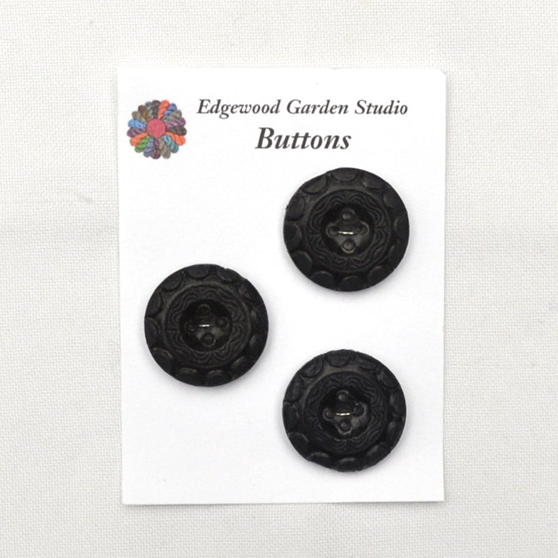 A set of three black buttons with an embossed pattern. Four attachment holes