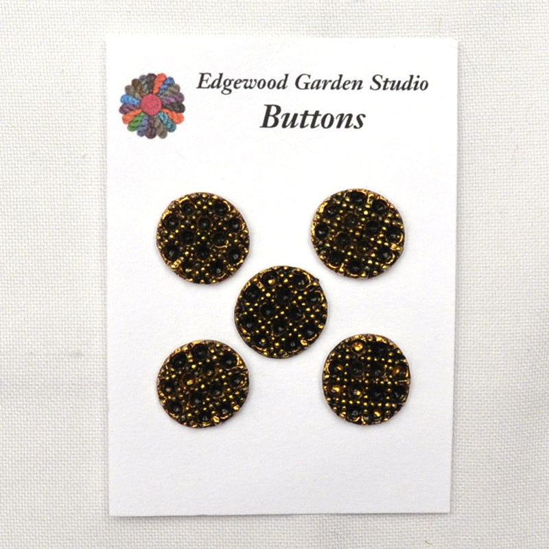 A set of five black and gold buttons with a grid pattern. Single attachment loop.