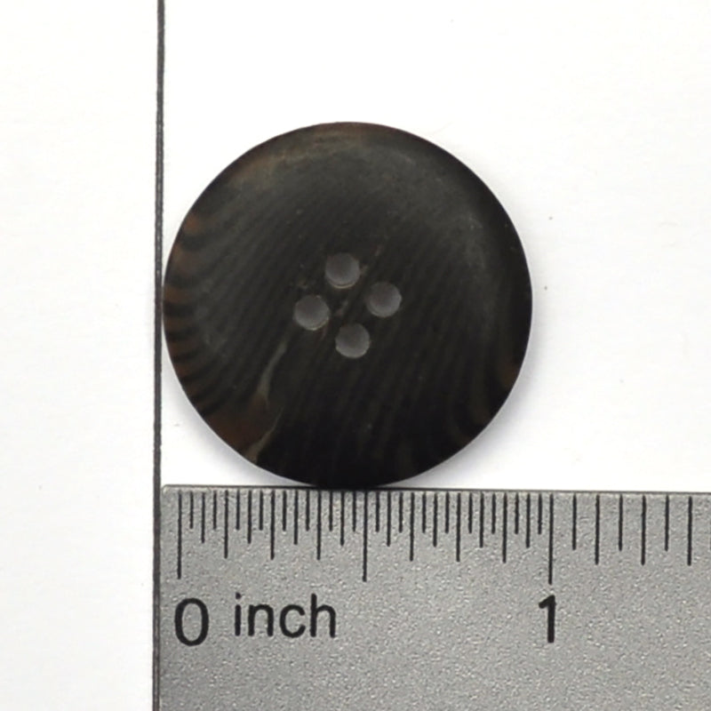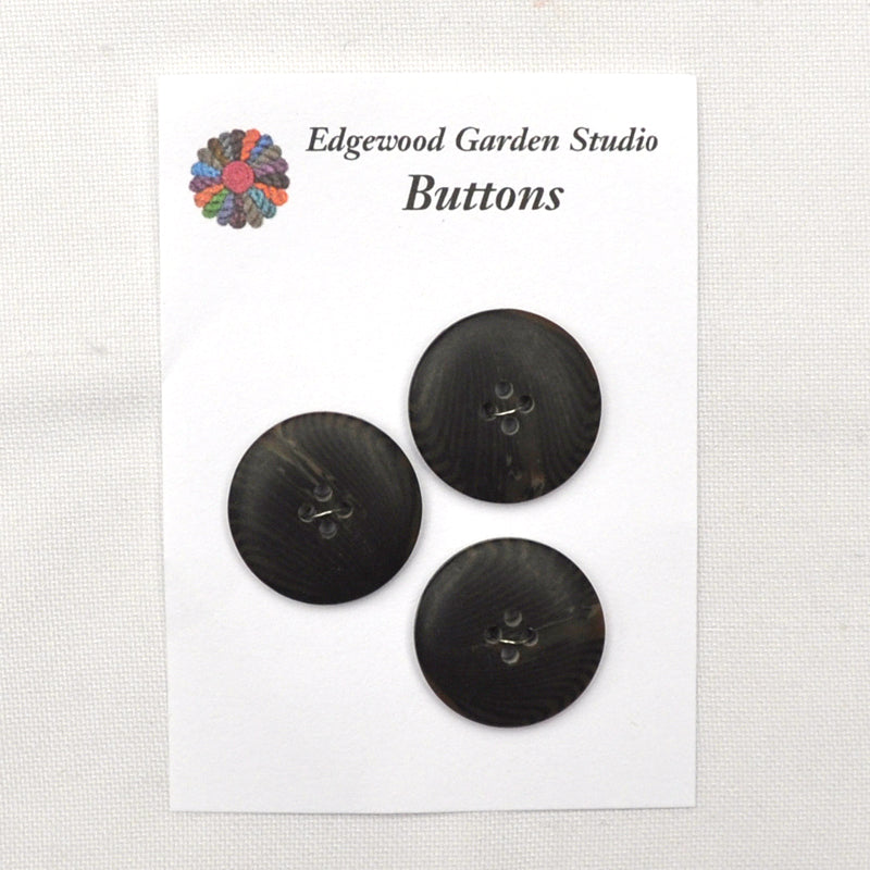 A set of three black buttons with a simulated wood grain. Four attachment holes.