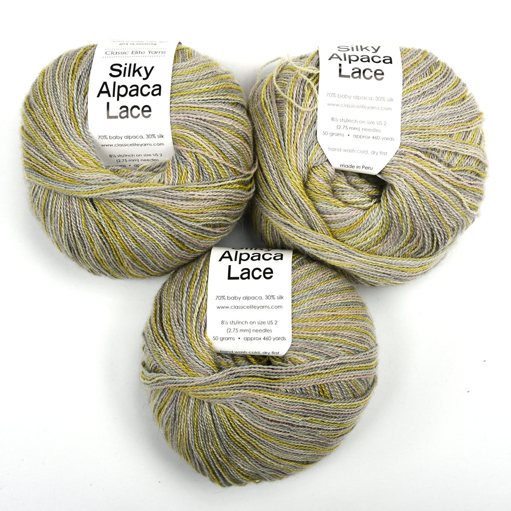 This is a very soft yarn made from 70% baby alpaca and 30% silk, in a lace weight. Each skein is 50g and approximately 460 yards. Classic Elite is no longer in business.