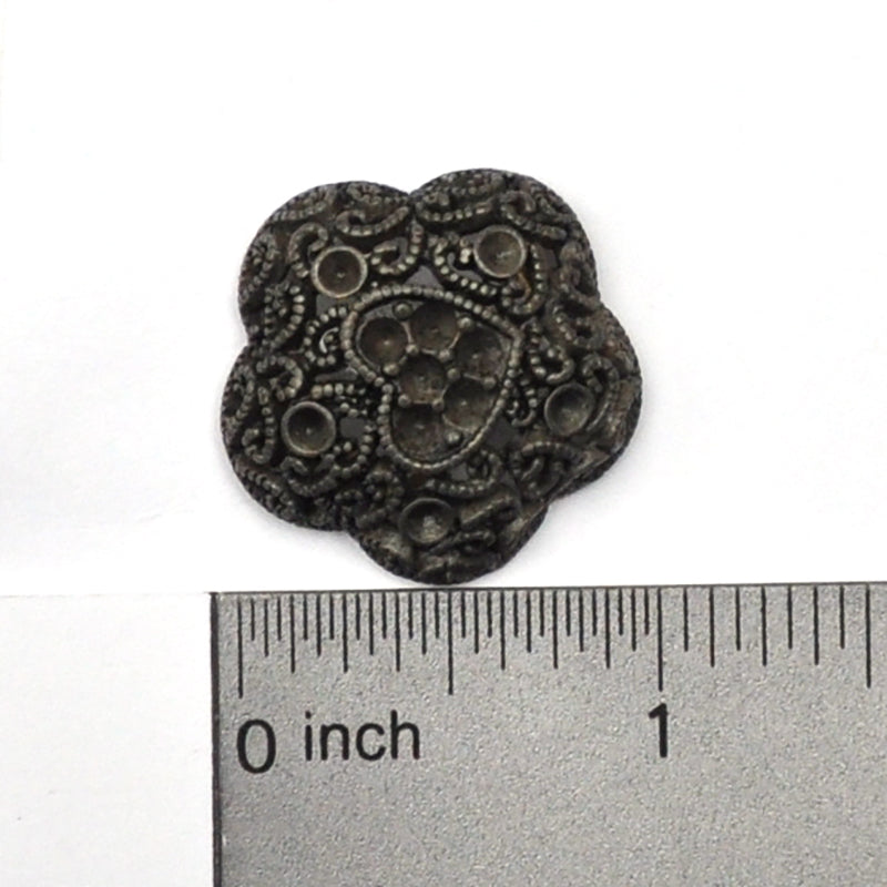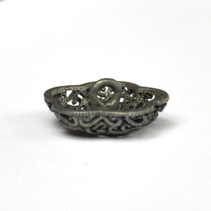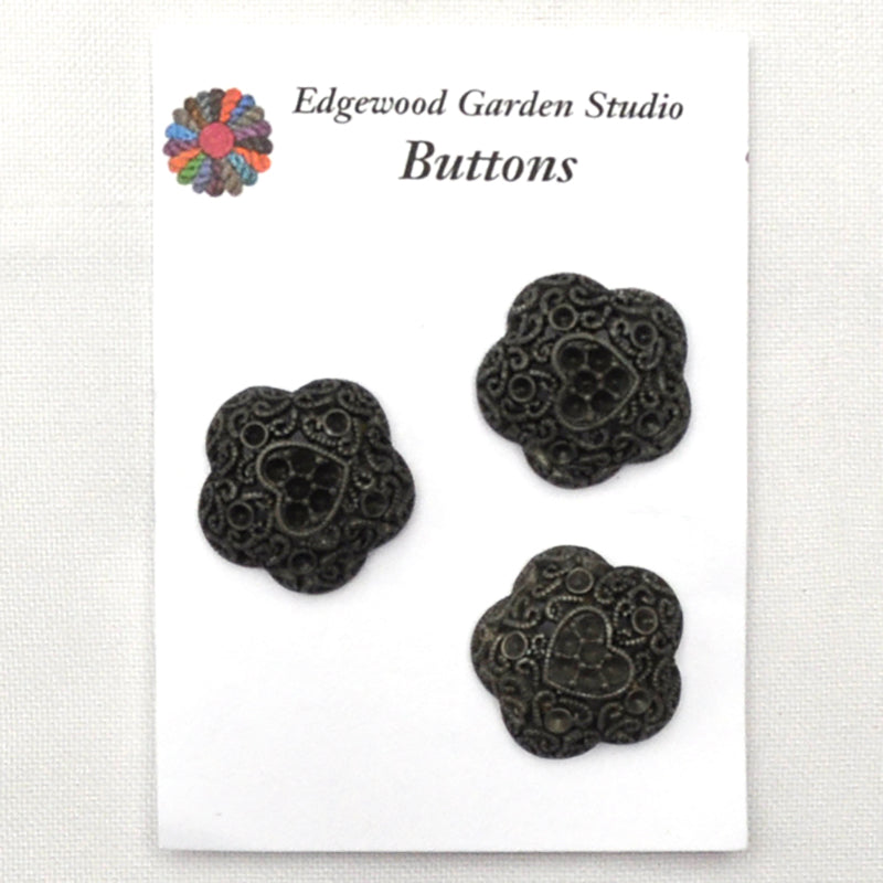 A set of three cast buttons in silver and black filigree. Each button has five rounded points and a central heart motif surrounded by abstract patterns. Single loop on the back for attachment