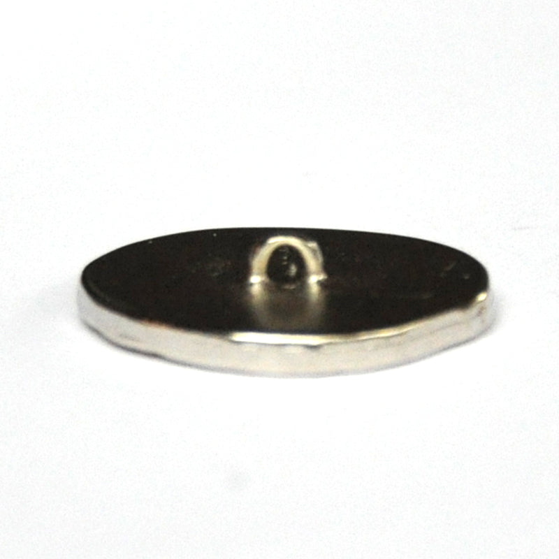 A set of three slightly irregular round silver metal buttons with pattern of three irregular stripes. Single loop on the back for attachment
