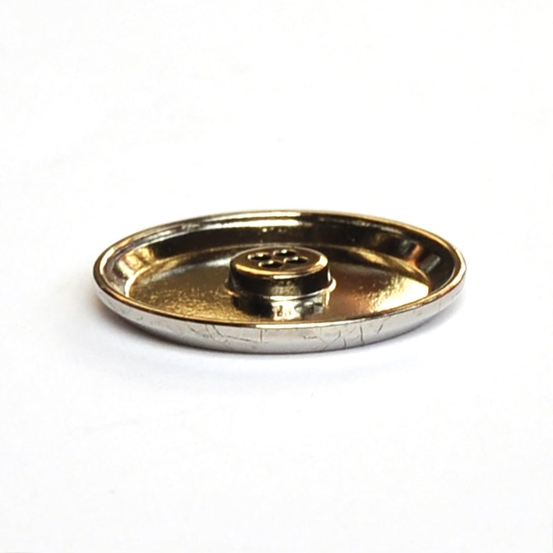 A set of three round silver metal buttons with scratch pattern. Four attachment holes.