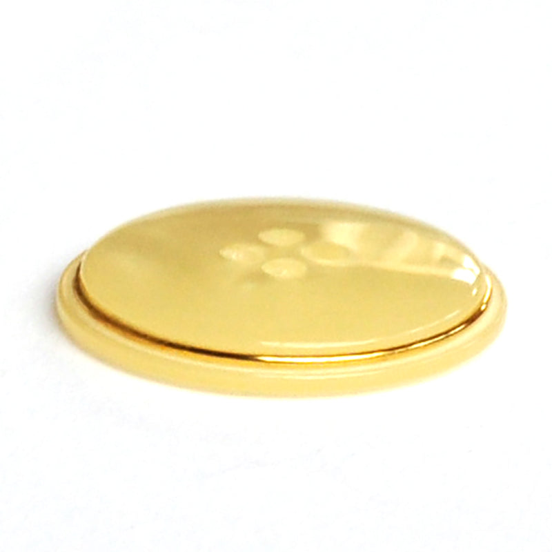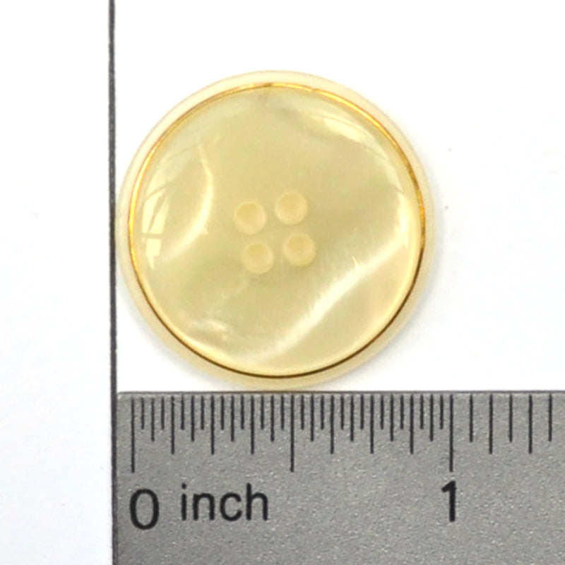 A set of three white pearlescent buttons with a gold rim. Four attachment holes.