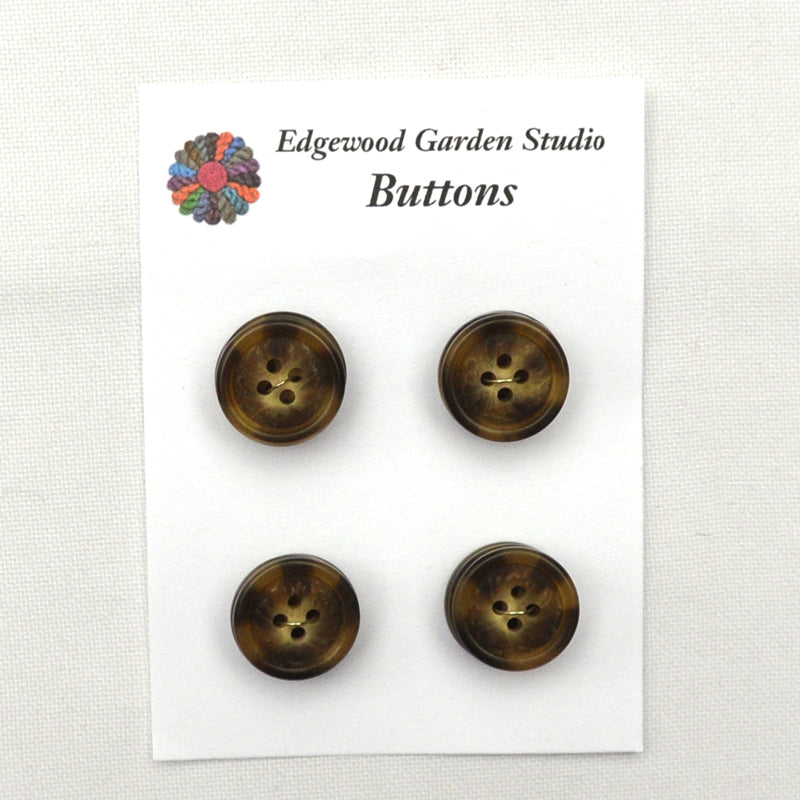 A set of twelve buttons with a faux horn appearance in dark brown. Four attachment holes.