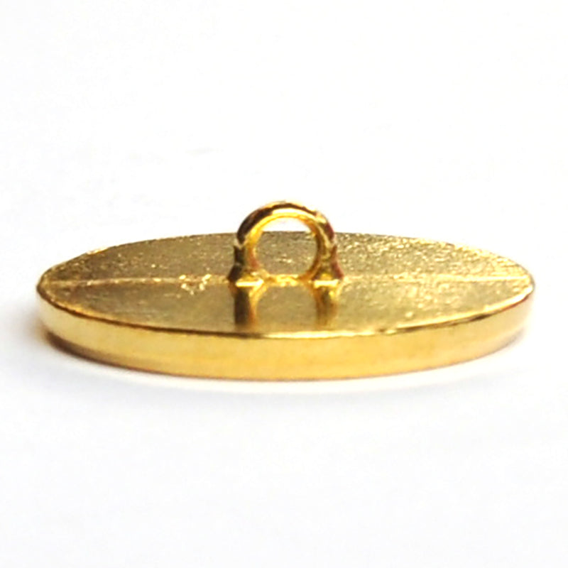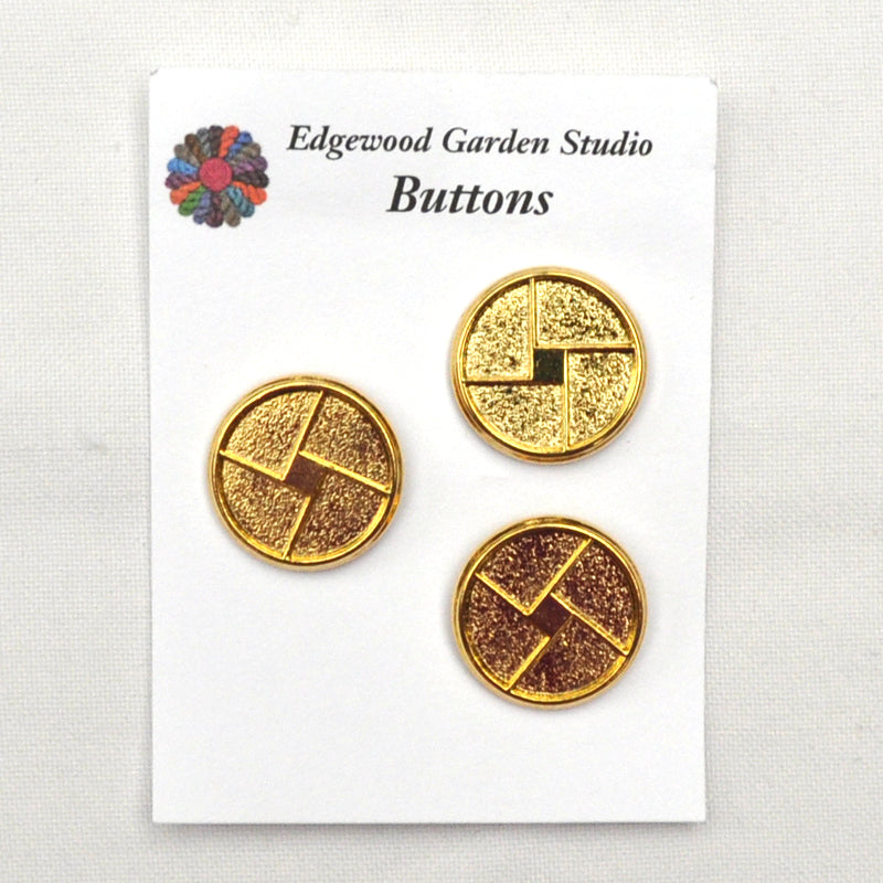 A set of three gold colored buttons with a pinwheel pattern. Single attachment loop.
