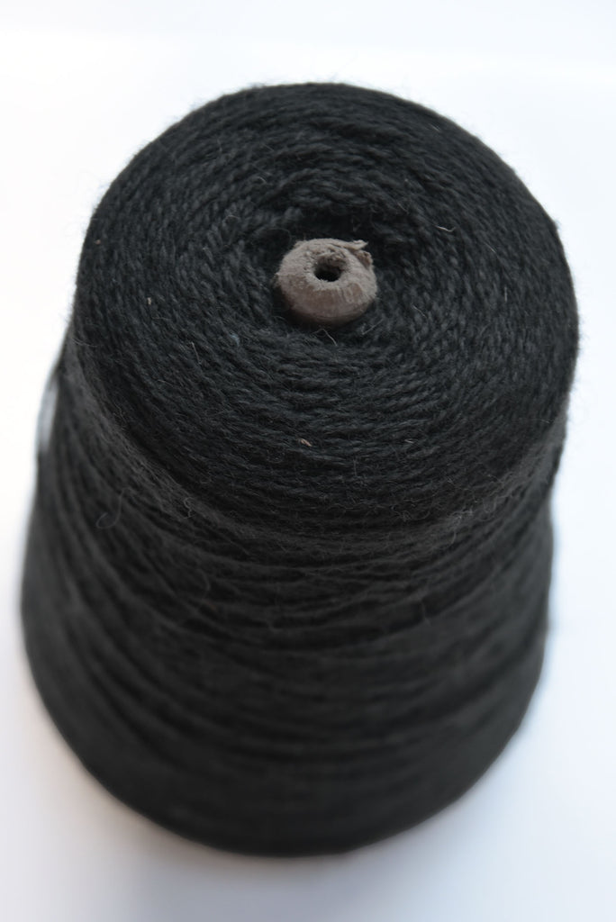 This cone has no identifying marks. It is a coarse, hairy black wool in a somewhat loose 2-ply, on a cardboard cone. It is sold black in color. It wraps at about 18wpi, and appears to be worsted weight. This is a large, 2-pound cone. It is possible that it came from Pendleton Mills. It should work well as a weft in many weaving projects. A rough estimate is that the spool holds 2,200 yards.